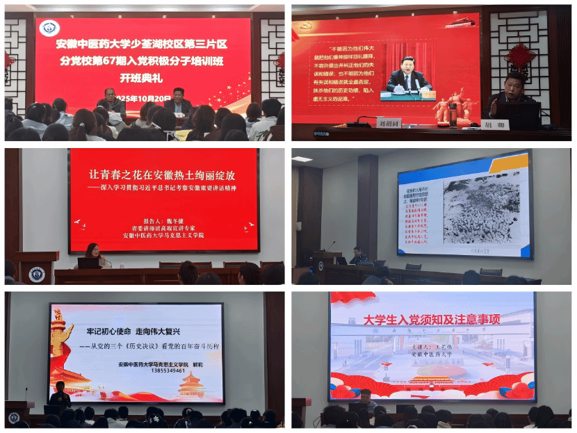 10月20日至10月29日,安徽中医药大学少荃湖校区第三片区分党校第67期入党积极分子培训顺利开展。本次培训由药学院、体育健康学院联合举办,培训内容安排了专题讲座、特色党课、专题研讨和实践课程。共150名入党积极分子参与学习。