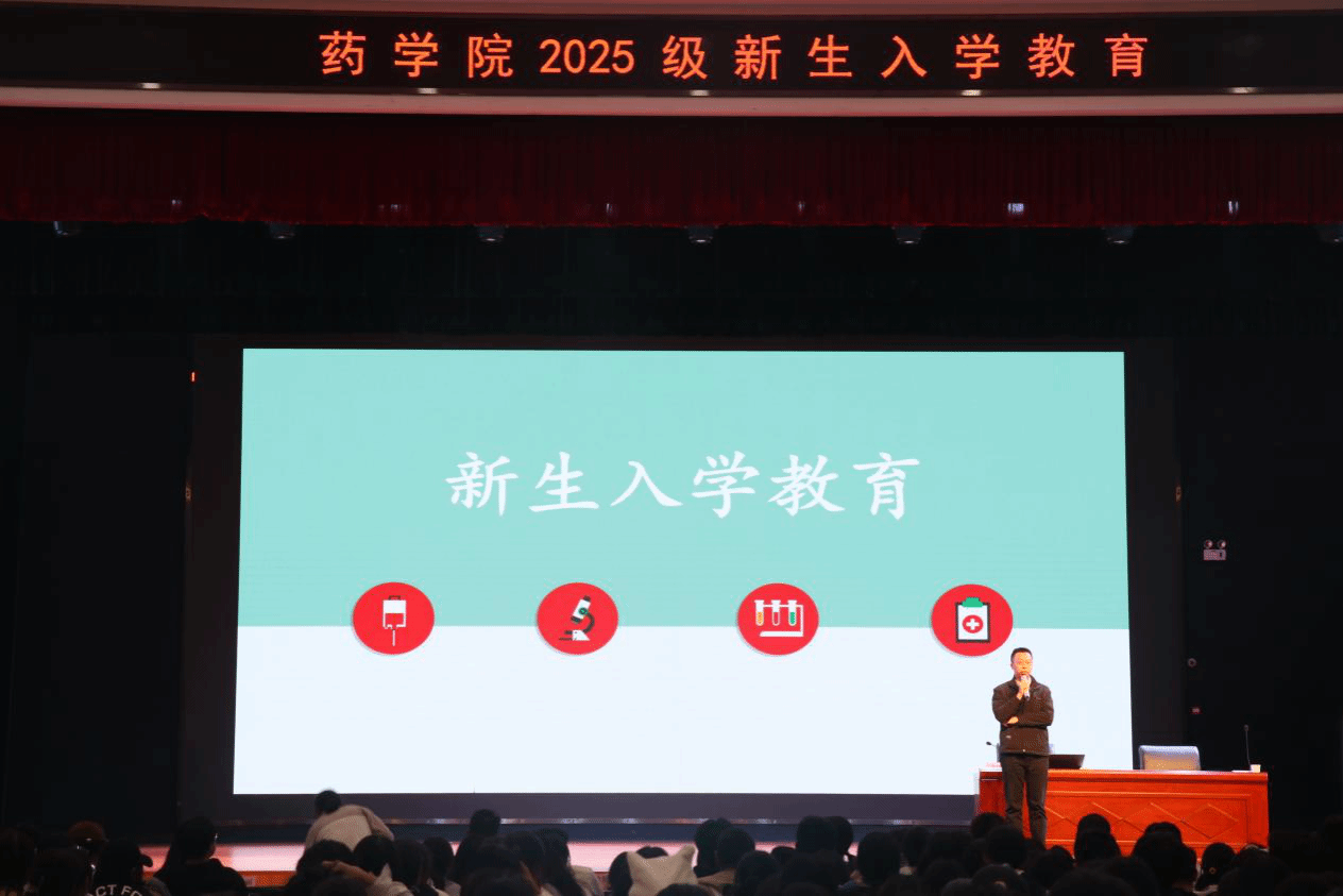 11月10日晚,药学院2025级新生入学教育系列讲座在大学生活动中心举行。药学院执行院长韩岚、校外专家、2025级新生辅导员及全体2025级本科新生参加大会,学院党委副书记陶曜天主持会议。