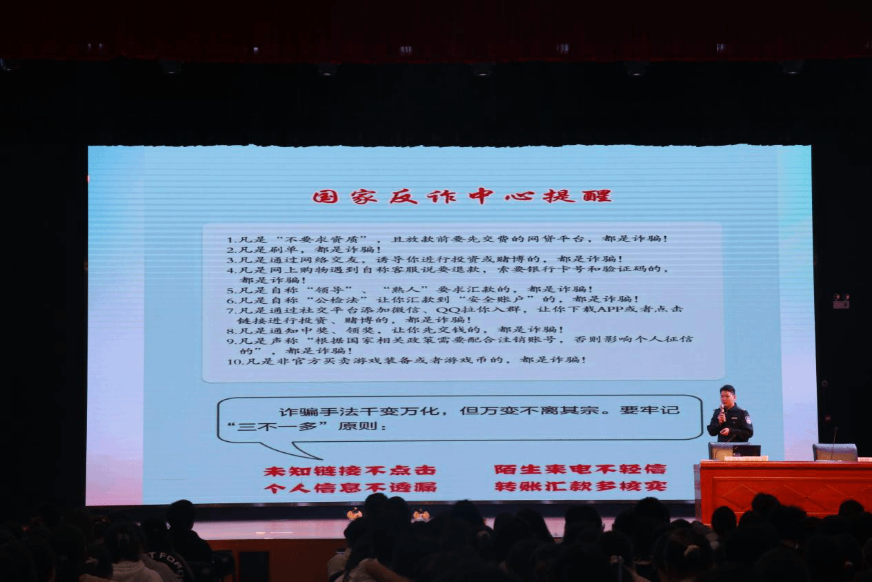 合肥市公安局新站分局反诈中心潘富豪警官进行防范电信网络诈骗宣讲。他详细介绍了防电诈知识,并结合真实案例,重点讲解“刷单返利类诈骗”“网络游戏产品虚假交易类诈骗”“婚恋、交友类诈骗”三种常见的诈骗形式。讲解过程中,潘警官还组织互动问答环节,同学们积极参与、踊跃作答,现场气氛十分热烈。