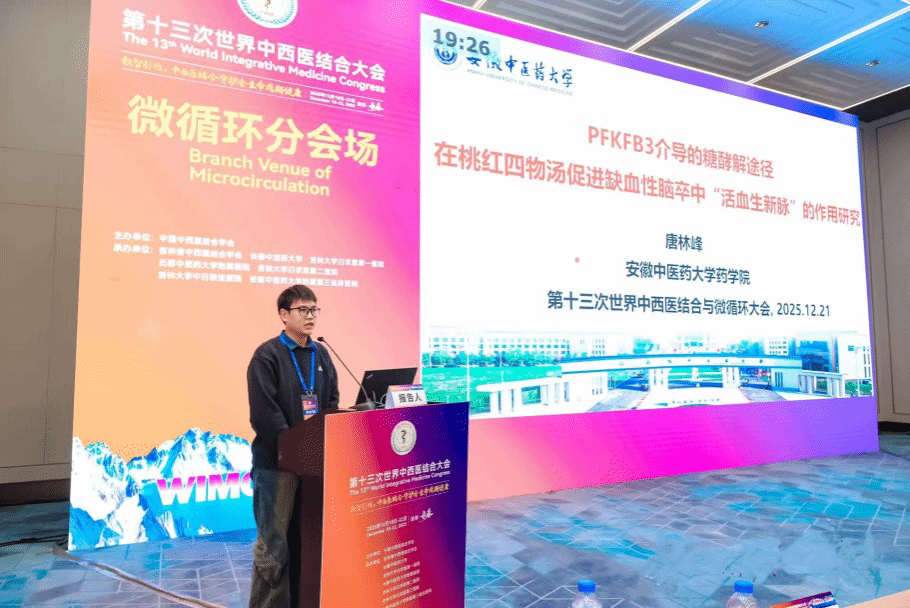 12月20日-22日,第十三次世界中西医结合大会在吉林长春举行,本次大会吸引了全球相关领域学者、专家及科研人员参与。药学院桃红四物汤课题组受邀参会,由彭代银教授、韩岚教授共同指导2024级博士研究生唐林峰在微循环分会场,代表课题组汇报了桃红四物汤治疗缺血性脑卒中“祛瘀生新”机制研究的相关工作进展。
