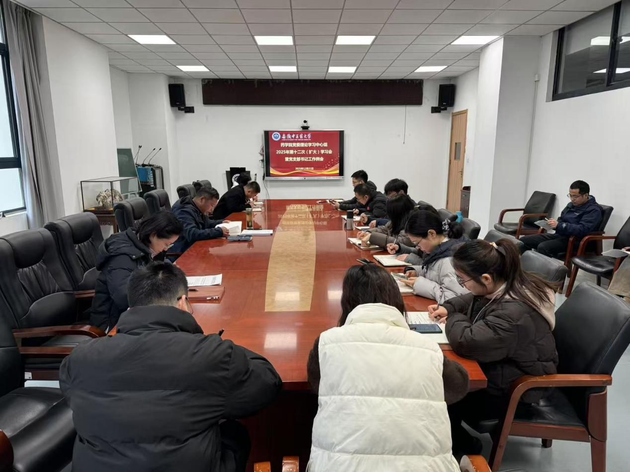 12月31日上午,药学院党委召开理论学习中心组(扩大)2025年第十二次学习会暨党支部书记工作例会。会议由党委书记胡卿主持,学院党委委员、各支部书记参会。