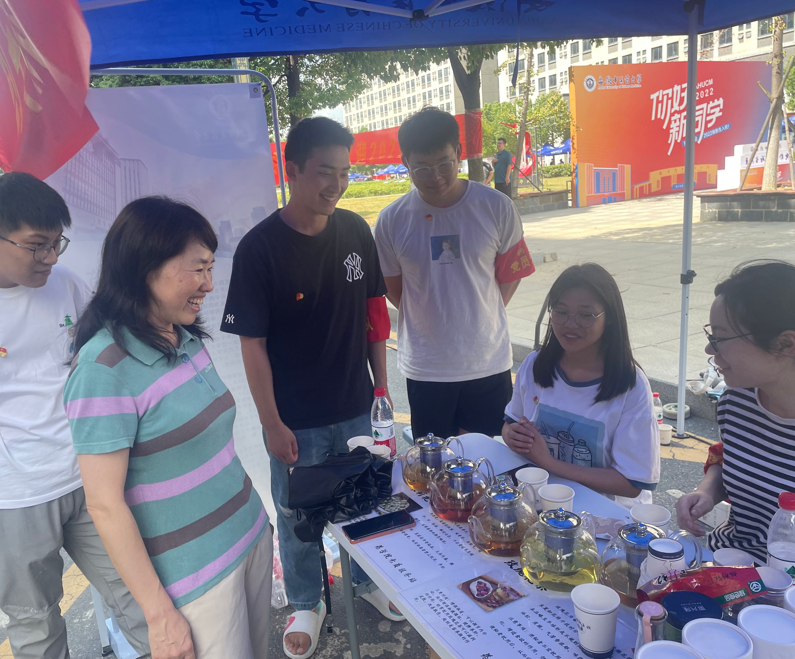 晨光熹微,党员先锋队队员们全员到达“药学院党员服务中心”,提前进行物资整理。随后,分别在学校南门和西门设置了“家长休息服务区”和校园内设置了“新生加油站服务区”,并准备了各式中药花茶品鉴、中药标本展示。上午七点,迎新工作正式开始。一张张热情的笑脸、一句句亲切的问候、一项项贴心的服务,欢迎着来自祖国各地的莘莘学子。