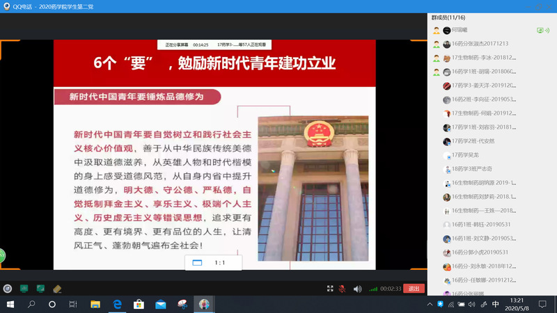 为弘扬五四运动精神,药学院学生第二党支部于2020年5月8日13:00通过“腾讯QQ视频”平台,开展了“弘扬五四精神、铭记时代英雄”主题党课。会议由支部党员张顺主持,学生第二党支部书记何瑞曦主讲,全体党员参与会学习。