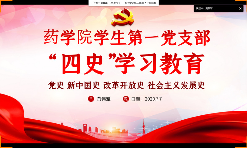 7月7日下午2点,药学院学生第一党支部运用“QQ视频通话”网络平台,开展“四史学习教育”主题党课。会议由药学院学生第一党支部书记黄伟军主持,学生第一党支部全体党员参会。