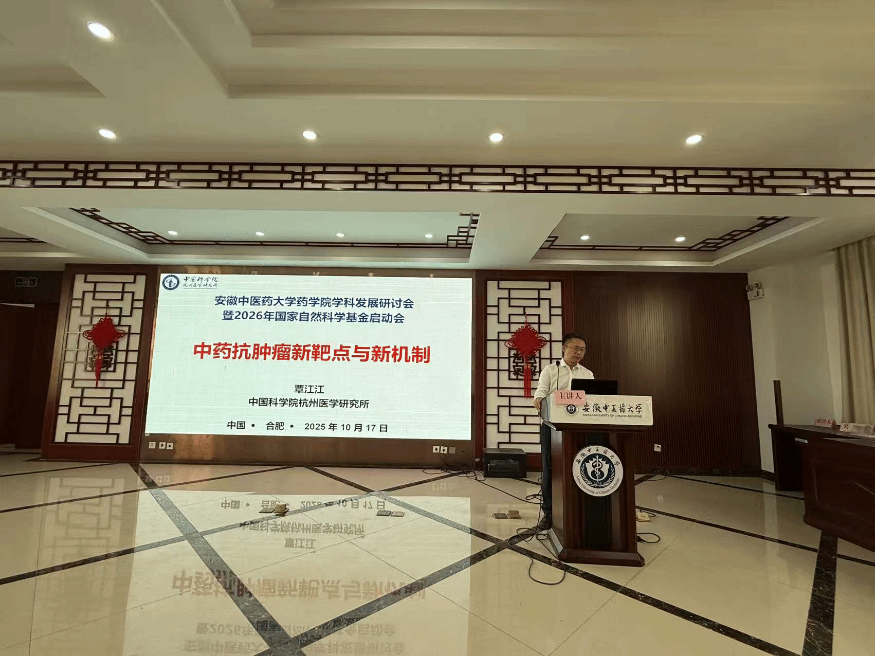 会议第一阶段为高水平的学术辅导。学院特邀中国科学院杭州医学研究所覃江江研究员作题为 “中药抗肿瘤新靶点与新机制” 的专题讲座。覃研究员聚焦前沿,重点分享了其团队在两个方面的最新研究成果:一是胃癌铁死亡耐受相关机制的发现与中药干预研究;二是基于中药化学生物学的胰腺癌免疫逃逸新机制探索。讲座内容翔实、逻辑清晰,为在场师生开拓了科研思路。