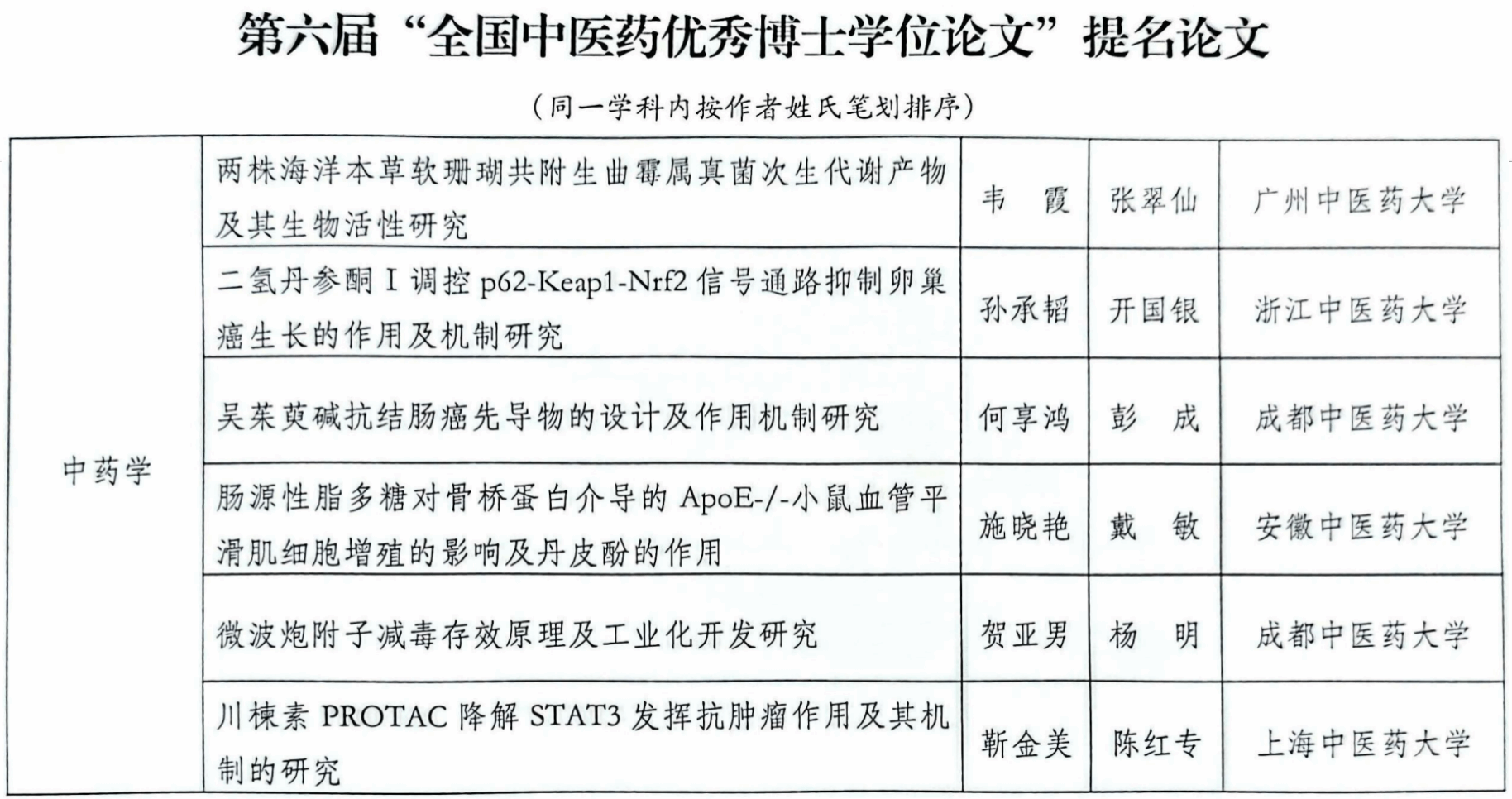 “全国中医药优秀博士学位论文”评选是由国务院学位委员会中医学、中西医结合、中药学学科评议组主办,面向全国中医药学位授予单位开展严格评审,是中医药领域博士学位论文的最高学术荣誉之一。其评选遵循“公正公开、注重创新、科学严谨、宁缺毋滥”的原则,旨在于进一步提高中医药博士研究生的培养质量,建立和完善中医药博士学位论文的质量评价体系,促进优秀中医药博士研究生的创新发展。本年度共评出优秀博士学位论文3篇,优秀博士学位论文提名论文17篇。我校在“全国中医药优秀博士学位论文”上的获奖,标志着学校在学学科建设、人才培养等方面正稳步发展、不断突破。(药学院/文图 胡卿/审核)