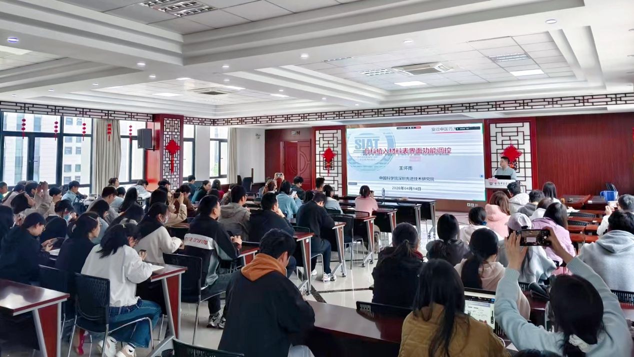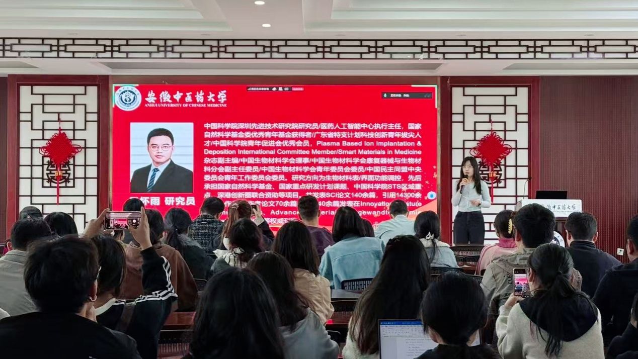2026年4月14日,中国科学院深圳先进技术研究院研究员/医药人工智能中心执行主任,国家自然科学基金委优秀青年基金获得者王怀雨研究员受邀莅临我校,在药学院380会议室作了题为《骨植入材料表界面功能调控》的学术报告。本次讲座由我校科技处、药学院及国家转化医学科学中心(上海)合肥分中心主办,安徽省中医药科学院药物制剂研究所、药物制剂技术与应用安徽省重点实验室及药剂学安徽省特色学科协办。报告会由药学院胡希研究员主持,众多科研骨干教师及研究生到场参加。