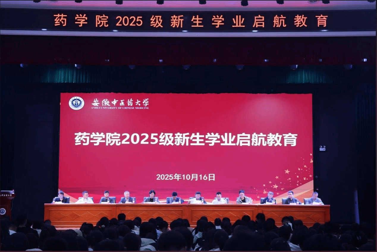 10月16日晚,药学院2025级新生学业启航教育大会在大学生活动中心举行。药学院党政领导、教学督导、八系两中心主任、2025级新生辅导员、班主任,全体2025级新生、部分老生代表参加大会,学院党委副书记陶曜天主持大会。