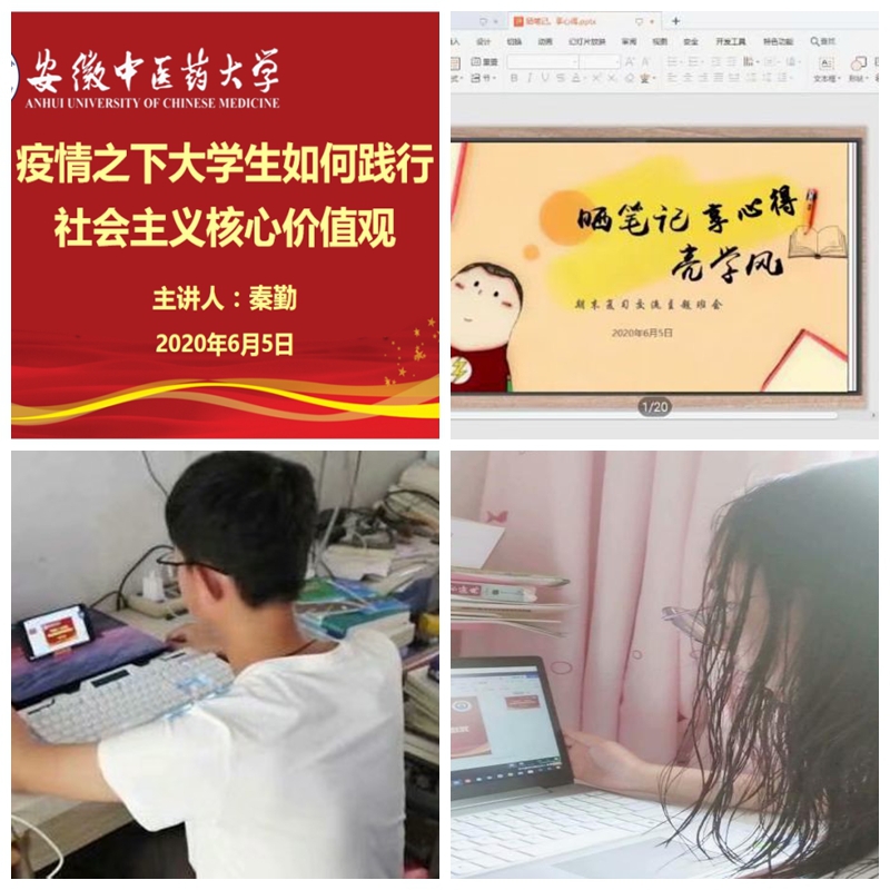 首先,辅导员王艺伟将同学们疫情期间的笔记与大家一一分享,并且强调笔记对我们学习的重要性,良好的学习方法能让我们事半功倍。然后,同学们踊跃地发言,分享了自己的学习方法以及在此次线上学习过程中的收获。最后,秦勤老师给同学们带来了《疫情之下大学生如何践行社会主义核心价值观》讲座,作为新时代青年,要牢固树立并践行社会主义核心价值观,争取做到德智体美劳全面发展,努力成为社会主义的合格建设者和可靠接班人。最后,辅导员王艺伟对各位同学此次疫情以来线上认真学习表示认可,希望同学们在家中能继续加强自我管理,提升自主学习能力和综合素质。