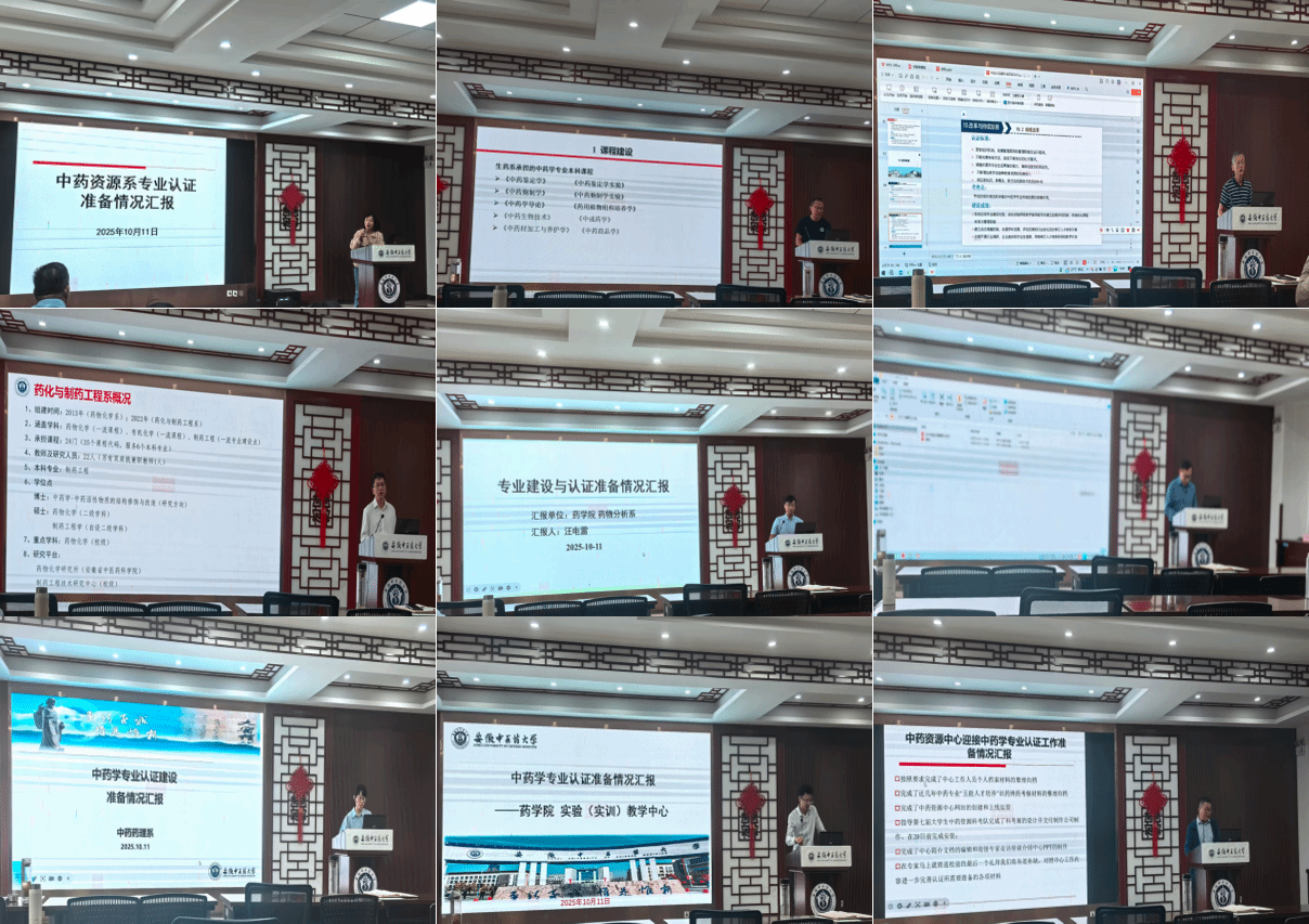 随后,中药资源系、生药系、中药与天然药物化学系、药化与制药工程系、药物分析系、药剂系、中药药理系、实验(实训)教学中心、中药资源中心等与中药学专业建设相关的系与中心依次就师资队伍建设、学科建设、课程建设、教育教学改革亮点工作和认证准备情况进行了详细汇报。