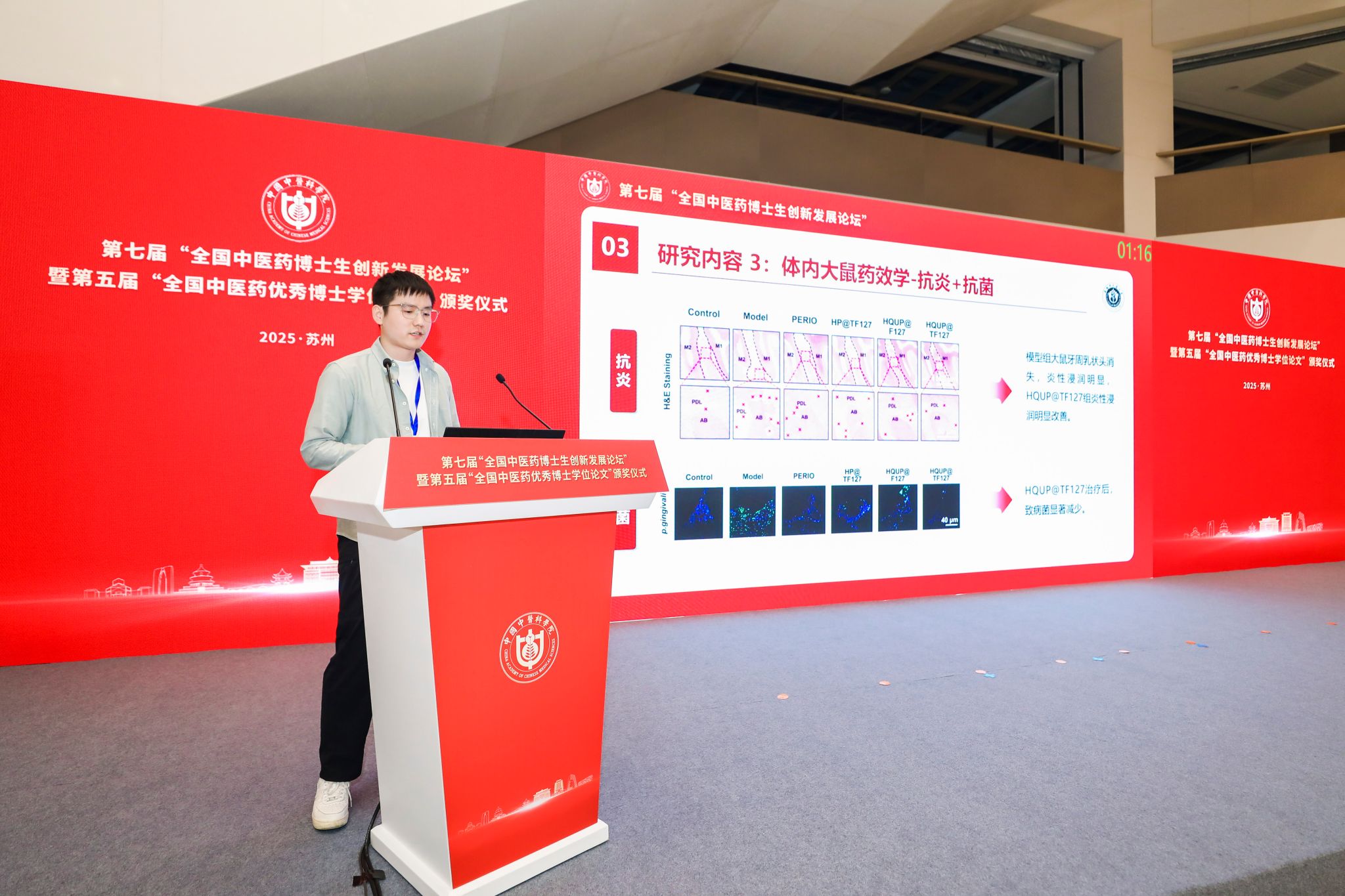 “全国中医药博士生创新发展论坛”是我国中医药领域博士生学术交流的高层次平台,2025年度论坛共设置一等奖4项、二等奖8项、三等奖16项,优秀奖40项。我校2024级中药学博士生王桂春(导师桂双英教授)的论文《多功能水凝胶靶向内质网应激促牙周再生》荣获“优秀论文二等奖”,2024级中医专博生陈祝越(导师谢道俊教授)的论文《谢道俊教授基于丹溪学说探讨中西医结合论治情志病经验撷粹》获优秀奖,充分展现了学校在中医药创新人才培养方面的卓越成效。