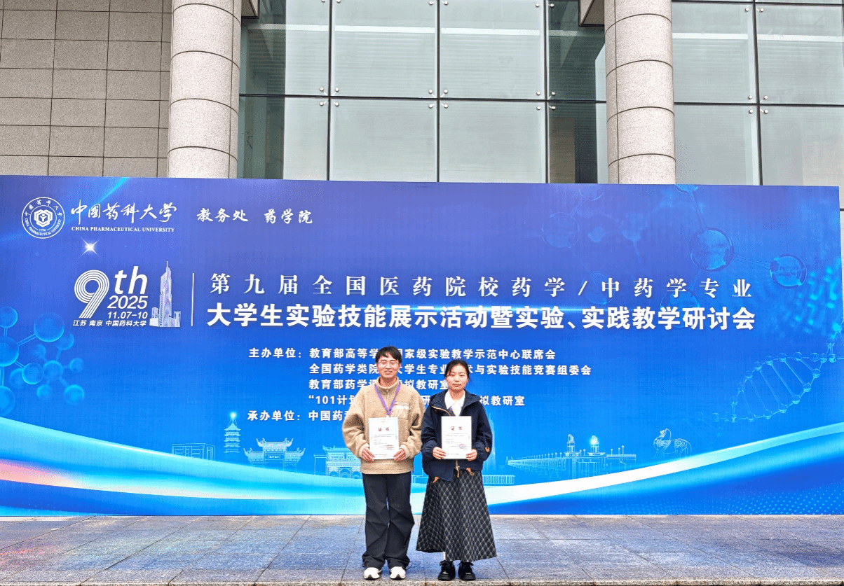 2025年11月7日-9日,第九届全国医药院校药学/中药学专业大学生实验技能展示活动在中国药科大学举行。本次活动由教育部高等学校国家级实验教学示范中心联席会、全国药学类院校大学生专业技术与实验技能竞赛组委会、教育部药学课程虚拟教研室、“101计划”中药新药研究课程虚拟教研室主办,中国药科大学承办。本次活动吸引了全国160多所高校,共计318名参赛选手,总计900多名师生参与。参与度创历史新高,已发展成为在全国有重大影响力的权威赛事。经过激烈紧张的角逐,我校2022级药学专业傅心怡同学荣获特等奖,2022级中药专业程国良同学荣获一等奖。
