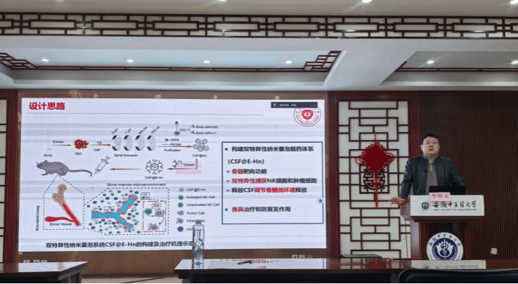 讲座伊始,李斯文教授深入浅出地阐述了当前恶性血液肿瘤治疗面临的重大挑战。他指出,这些疾病的根源在于骨髓中的病变,而传统疗法难以精准清除骨髓中的肿瘤细胞,且常伴随严重的脱靶毒性和疾病复发风险。针对这一科学难题,李教授团队创新性地构建了一种骨髓靶向的双特异性纳米囊泡系统CSF@E-Hn。该系统以造血干细胞来源的纳米囊泡为载体,表面修饰肿瘤细胞抓捕抗体(aPD-L1)和NK细胞激活配体(aNKG2D),同时内核装载集落刺激因子。该设计可实现三重协同效应:一是通过表面双配体将骨髓内源性NK细胞与肿瘤细胞拉近并激活,高效杀伤肿瘤;二是通过释放集落刺激因子重塑骨髓微环境,促进造血干细胞分化、增强记忆T细胞生成并维持骨稳态;三是依托纳米囊泡的天然骨髓归巢能力,实现靶向递送,降低脱靶毒性。小鼠模型实验显示,该系统在清除白血病及骨髓瘤细胞、延长生存期方面表现优异,且能有效预防肿瘤复发,同时展现出良好的生物安全性。
