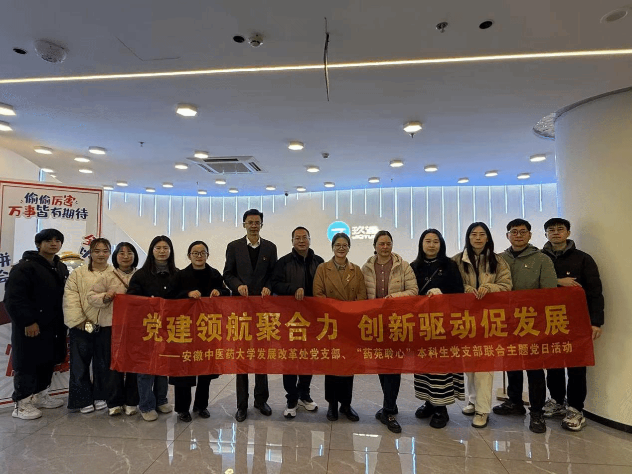 2025年11月18日上午,发展改革处党支部与“药苑聆心”本科生党支部共同前往玖通电商&金九灵芝公司,联合开展“党建领航聚合力 创新驱动促发展”主题党日活动。本次活动采用“党建+研学”模式,旨在努力汲取企业发展经验,凝聚发展动能,促进产教融合,助力学校高质量发展。