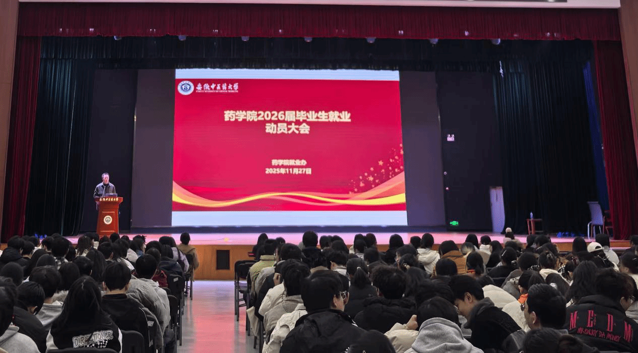 为进一步引导毕业生树立正确的就业观念,提升就业竞争力,扎实推进2026届毕业生就业工作,11月27日晚,药学院在大学生活动中心召开2026届毕业生就业动员会暨校友经验分享会。学院党委副书记陶曜天,药学院优秀校友、华润三九医药有限公司医馆运营经理范朗,全体毕业班辅导员以及2026届全体毕业生参加会议。